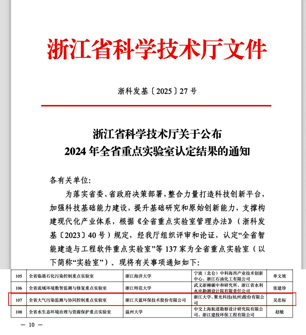2025年6月4日,浙江省科技廳發(fā)布《浙江省科學技術廳關于公布2024 年全省重點實驗室認定結果的通知(浙科發(fā)基〔2025〕27號)》,由浙江天藍環(huán)保技術股份有限公司牽頭,浙江大學和聚光科技(杭州)股份有限公司共建的“全省大氣污染監(jiān)測與協同控制重點實驗室”獲批組建,成為全省環(huán)境領域唯一以企業(yè)牽頭建設的省級重點實驗室